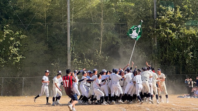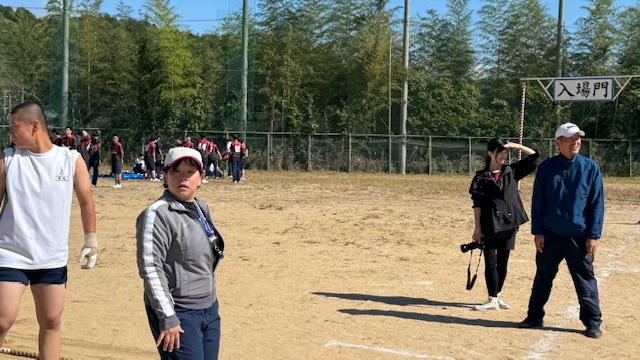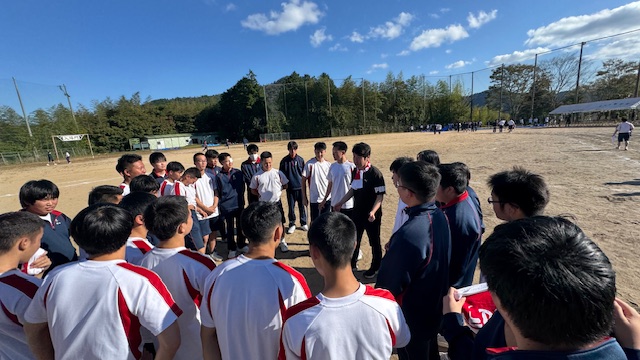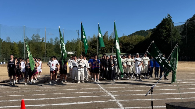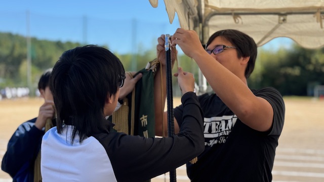 学校を代表して戦う選手たちがユニフォーム姿で掲げる部旗が、秋の空に堂々と揺らいでいました。