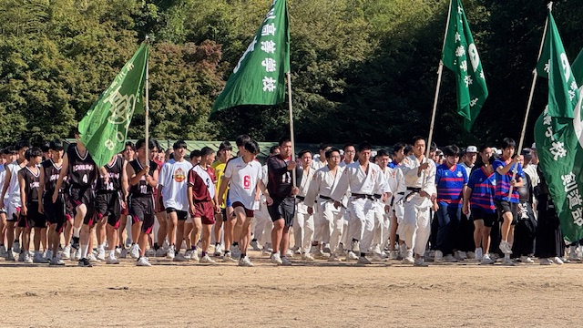部活動行進では、運動部に所属する生徒たちが各部のユニフォームに身を包み、整列して凛々しく行進を行いました。