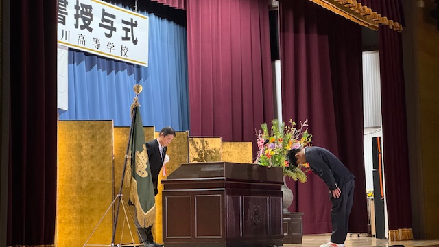 私学連合会長賞・妙心寺管長賞・兵庫県私学理事長賞に加え、今年度は「特別善行賞」と題して、自主トレーニング中に人命救助を行った生徒を特別表彰しました。
